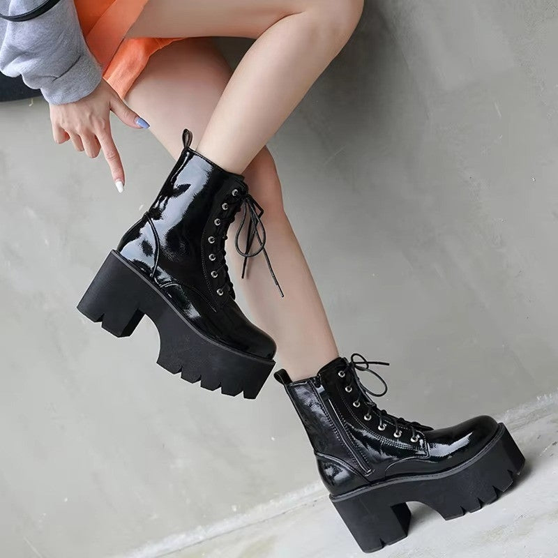 Gothic Platform Boots Women Black Patent Leather Lace Up Wedge Heels fuse dramatic silhouette with everyday functionality. Made from glossy black patent leather, this design commands attention while staying versatile for day-to-night wear. The lace-up front with sturdy metal eyelets ensures a secure, customizable fit, while the concealed platform and wedge create a bold lift without sacrificing stability.